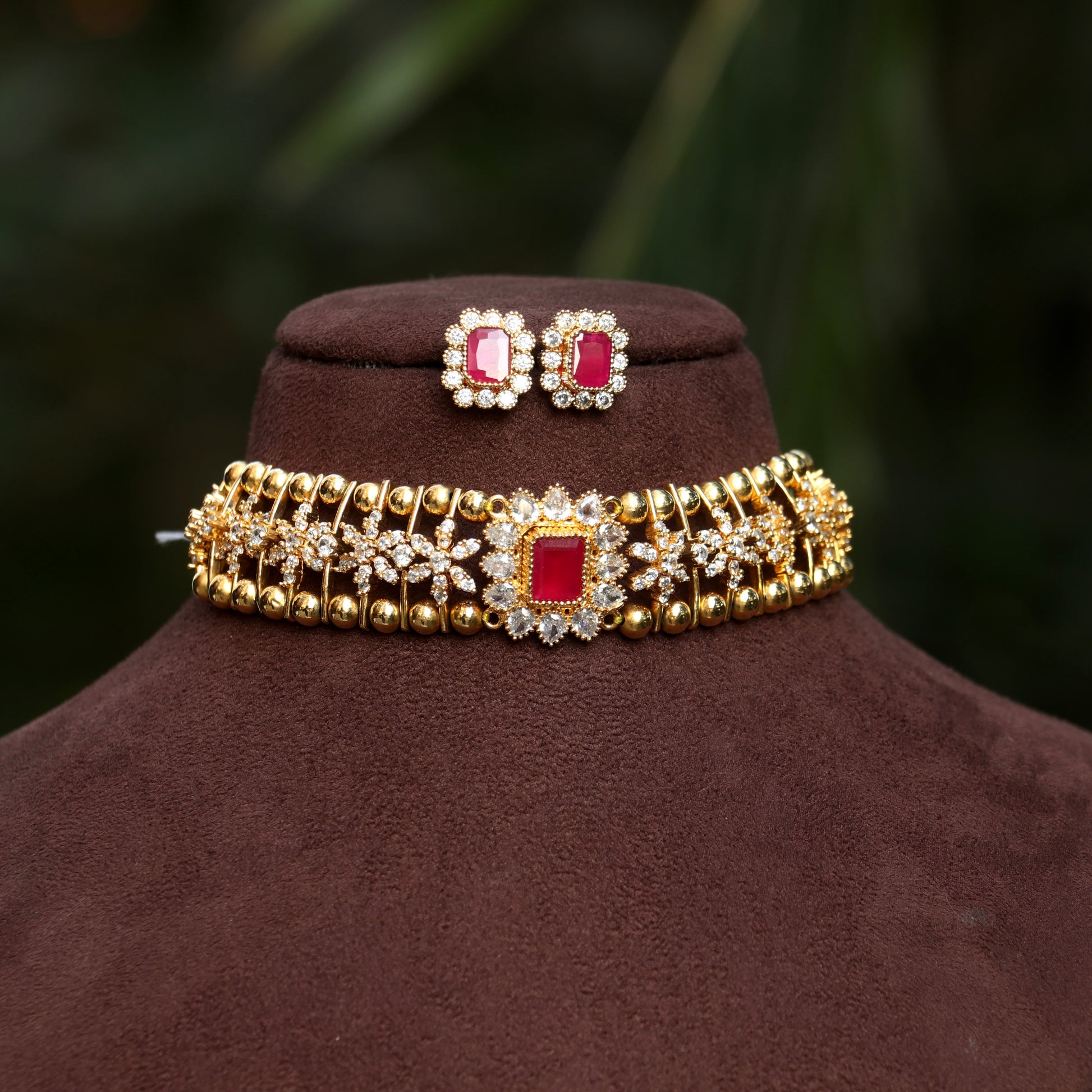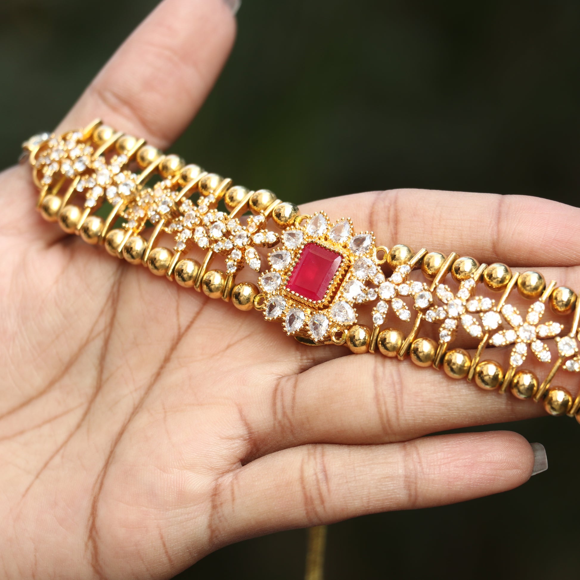 AD Stone Floral Gold Ball Necklace